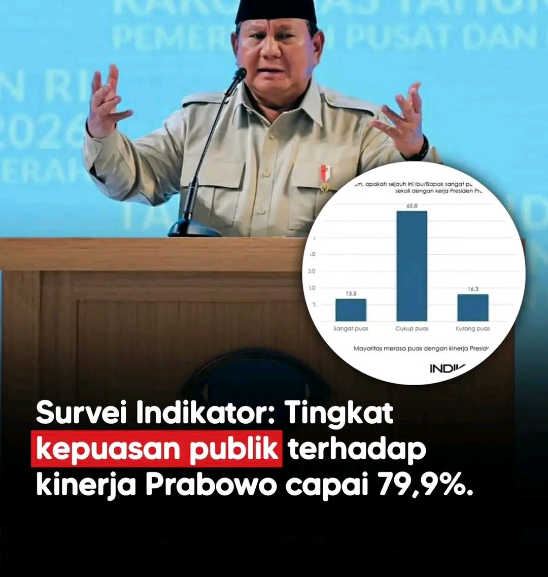 JAKARTA — Hasil survei nasional yang dirilis Indikator Politik Indonesia menunjukkan tingkat kepuasan publik terhadap kinerja Presiden Prabowo Subianto mencapai 79,9 persen. Angka ini